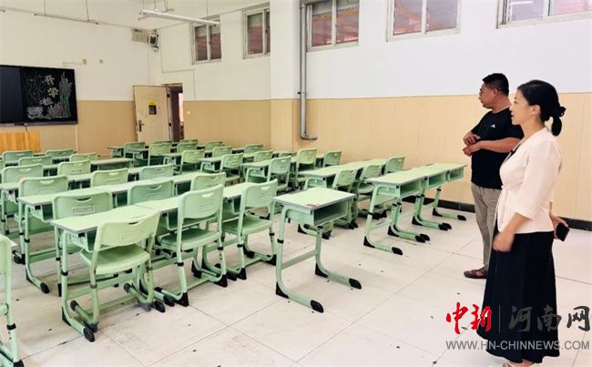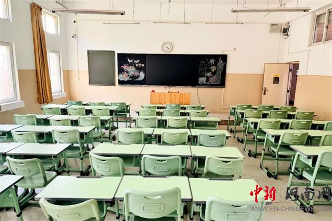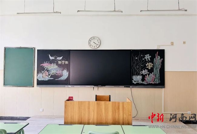 教室的課桌椅已逐一套裝調(diào)試,黑板旁的智能交互屏預存了開學第一課的課件,連粉筆盒都按「左白右彩」的標準整齊擺放。