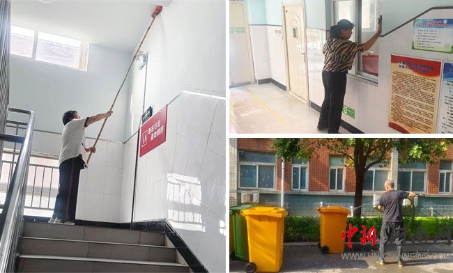 傍晚的夕陽下,保潔阿姨正彎腰擦拭教學樓和宿舍樓的每一層樓,讓愛融在細節(jié)里。
