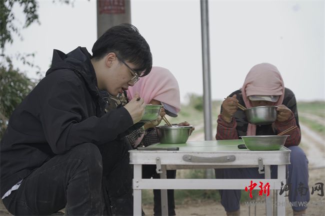 宋忠碩(左一)同參與碳護(hù)林建設(shè)的大姐們一起吃午飯