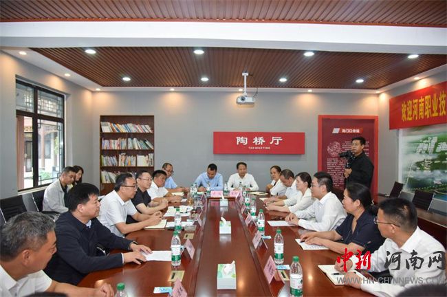 王奇山對(duì)學(xué)校在陶橋村鄉(xiāng)村振興中給予的支持表示感謝,充分肯定了駐村工作隊(duì)的辛勤付出與實(shí)際成效。他系統(tǒng)介紹了區(qū)、鄉(xiāng)、村三級(jí)發(fā)展現(xiàn)狀,并希望源匯區(qū)與河南職業(yè)技術(shù)學(xué)院在電子商務(wù)、技能培訓(xùn)、技術(shù)轉(zhuǎn)化與貿(mào)易等方面進(jìn)一步拓展合作,共同推動(dòng)地方經(jīng)濟(jì)社會(huì)高質(zhì)量發(fā)展。王仕梁對(duì)駐村工作隊(duì)半年來的工作成績予以高度評(píng)價(jià),并感謝學(xué)校一直以來的全面支持。陶橋村黨支部書記陶軍華介紹了本村基本情況和產(chǎn)業(yè)發(fā)展現(xiàn)狀,駐村第一書記張毅飛詳細(xì)匯報(bào)了前期工作成效、當(dāng)前困難與下一步計(jì)劃。