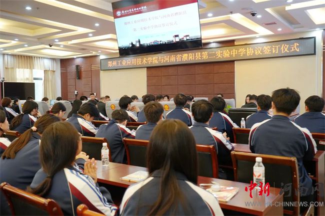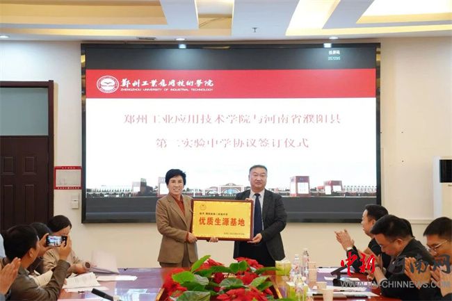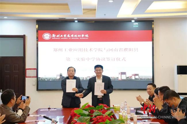中新河南網(wǎng)10月17日電 10月16日,鄭州工業(yè)應(yīng)用技術(shù)學(xué)院與河南省濮陽縣第二實驗中學(xué)生源基地協(xié)議簽訂儀式在行政管理中心二樓會議室舉行。此次簽約,不僅是鄭工學(xué)院發(fā)展史上開啟教育新篇章的重要征程,更是通過與基礎(chǔ)教育領(lǐng)域優(yōu)質(zhì)學(xué)校的深度融合,將共建生源基地轉(zhuǎn)化為推動校地教育協(xié)同的具體實踐。濮陽縣第二實驗中學(xué)教育集團(tuán)董事長蔡玉坤,校長張克來、副校長段盈武等班子成員及師生代表;中原華信控股集團(tuán)總裁、鄭州工業(yè)應(yīng)用技術(shù)學(xué)院理事長谷建光,校長閆兵攜班子成員、有關(guān)部門負(fù)責(zé)人參加簽訂儀式。簽訂儀式由鄭州工業(yè)應(yīng)用技術(shù)學(xué)院副校長賈圣強(qiáng)主持。