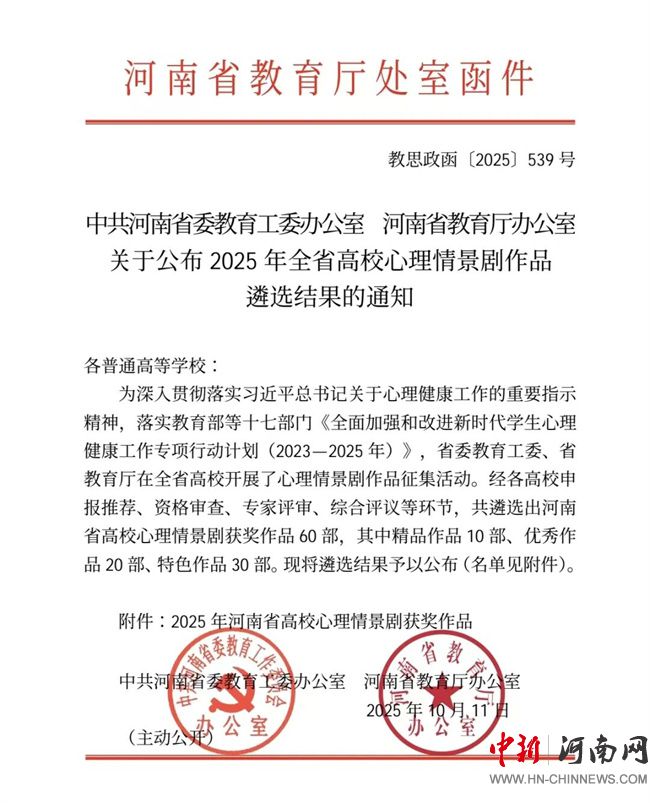 此次作品征集通過各高校申報、資格審查、專家評審、綜合評議等環(huán)節(jié),共遴選出河南省高校心理情景劇作品60部,其中精品作品10部、優(yōu)秀作品20部、特色作品30部。