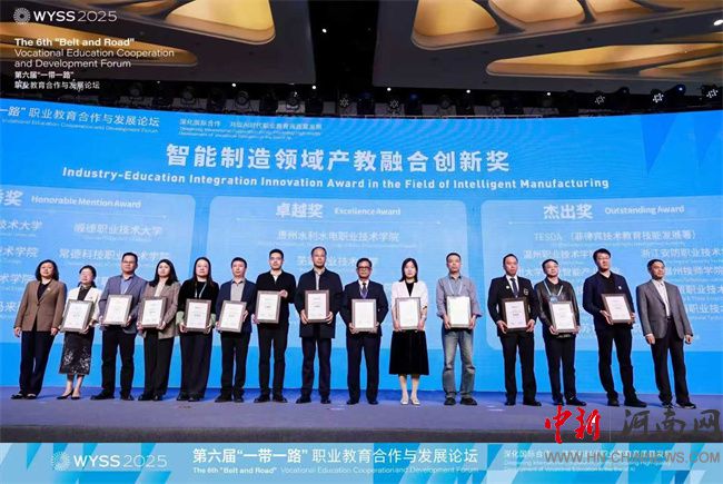 本次論壇匯聚了來自全球20多個(gè)國(guó)家和地區(qū)的600余位教育界專家、院校及企業(yè)代表,共同探討人工智能背景下職業(yè)教育發(fā)展的新路徑。信陽科技職業(yè)學(xué)院董事長(zhǎng)高云、校長(zhǎng)趙輝、副校長(zhǎng)謝語蔚等校領(lǐng)導(dǎo)應(yīng)邀參會(huì)。信陽科技職業(yè)學(xué)院憑借在智能制造領(lǐng)域的深厚積淀與產(chǎn)教融合的豐富成果,榮獲“智能制造領(lǐng)域產(chǎn)教融合創(chuàng)新獎(jiǎng)卓越獎(jiǎng)”。該獎(jiǎng)項(xiàng)是對(duì)該校精準(zhǔn)對(duì)接產(chǎn)業(yè)需求、創(chuàng)新人才培養(yǎng)模式成效的充分肯定,也為該校深化產(chǎn)教融合探索、持續(xù)推進(jìn)國(guó)際職業(yè)教育合作注入了強(qiáng)勁動(dòng)力。