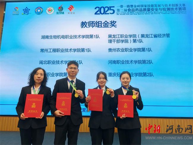 中新河南網(wǎng)11月26日電(崔萌甜)近日,2025“一帶一路”暨金磚國家技能發(fā)展與技術(shù)創(chuàng)新大賽——第二屆食品藥品質(zhì)量安全與檢測技術(shù)賽項在湖南長沙舉行。河南職業(yè)技術(shù)學(xué)院食品工程學(xué)院教師侯麗芬、崔萌甜、寧夢鴿、滿勇組隊參賽,憑借扎實(shí)的專業(yè)功底、精湛的操作技能與出色的團(tuán)隊協(xié)作,在全國76支教師參賽隊伍中脫穎而出,榮獲一等獎,展現(xiàn)了學(xué)校教師的卓越風(fēng)采。