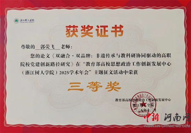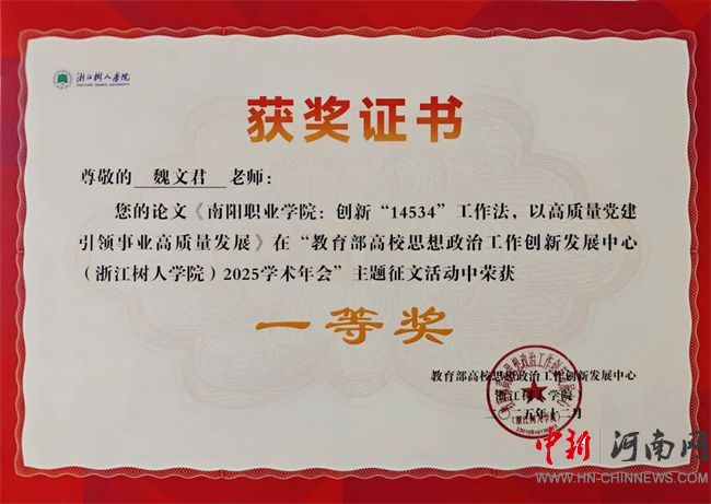 會議還對年度優(yōu)秀主題征文進行了表彰。南陽職業(yè)學(xué)院共有兩篇文章獲獎,其中黨委書記魏文君的《南陽職業(yè)學(xué)院:創(chuàng)新“14534”工作法,以高質(zhì)量黨建引領(lǐng)事業(yè)高質(zhì)量發(fā)展》獲一等獎,公共教學(xué)部主任郭熒飛的《雙融合·雙品牌:非遺傳承與教科研協(xié)同驅(qū)動的高職院校黨建創(chuàng)新路徑研究》獲三等獎,充分展現(xiàn)了該校在黨建與思想政治教育領(lǐng)域的理論思考深度與實踐創(chuàng)新成果。