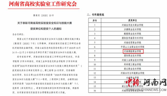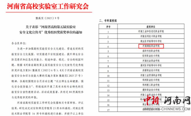 中新河南網(wǎng)12月30日電(文/譚永超) 12月28日,河南省高校實(shí)驗(yàn)室工作研究會(huì)發(fā)布《關(guān)于表彰河南省高校實(shí)驗(yàn)室安全文化宣傳月優(yōu)秀組織獎(jiǎng)的通知》(豫高實(shí)[2025] 9號(hào)),《關(guān)于表彰河南省高校實(shí)驗(yàn)室安全知識(shí)與技能大賽獲獎(jiǎng)單位和獲獎(jiǎng)個(gè)人的通知》(豫高實(shí)[2025] 10號(hào))。河南測(cè)繪職業(yè)學(xué)院在兩項(xiàng)評(píng)選中均獲表彰,榮獲“河南省高校第五屆實(shí)驗(yàn)室安全文化宣傳月優(yōu)秀組織獎(jiǎng)”和“2025年河南省高校實(shí)驗(yàn)室安全知識(shí)與技能大賽優(yōu)秀組織獎(jiǎng)”。這是對(duì)該校長(zhǎng)期重視并扎實(shí)推進(jìn)實(shí)驗(yàn)室安全工作的充分肯定。