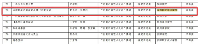 學(xué)校對此次比賽高度重視,參賽師生積極投入,所提交作品涉及文化與形象IP設(shè)計(jì)等多個(gè)方向,在此次比賽中學(xué)校師生獲得二等獎(jiǎng)1項(xiàng)、優(yōu)秀獎(jiǎng)4項(xiàng)。其中,趙玉龍、包慧利創(chuàng)作《古韻新姿河南汝瓷品牌IP形象設(shè)計(jì)》獲得教師組二等獎(jiǎng);由教師韓帥指導(dǎo)馬路瑤、郝會彤創(chuàng)作的《河南欒川城市萬象IP形象設(shè)計(jì)》,教師包慧利指導(dǎo)鄒英杰創(chuàng)作的《遇見河南主題文創(chuàng)IP形象設(shè)計(jì)》,教師王子琪指導(dǎo)張波創(chuàng)作的《“中原豫彩”河南豫劇文創(chuàng)IP設(shè)計(jì)》,教師劉芳芳指導(dǎo)翟樂樂、林楠楠?jiǎng)?chuàng)作的《河南開封美食灌湯包IP形象設(shè)計(jì)》分獲學(xué)生組優(yōu)秀獎(jiǎng)。