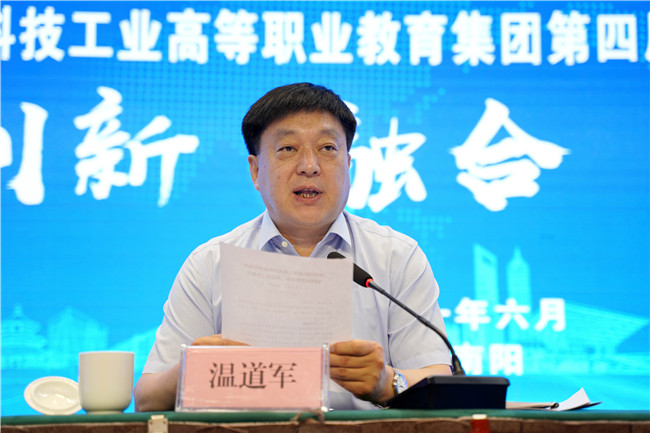 溫道軍做了河南國防科技工業(yè)高等職業(yè)教育集團工作報告。報告首先回顧了自河南國防科技工業(yè)高等職業(yè)教育集團第四屆理事會第一次會議召開以來在人才培養(yǎng)、人員培訓(xùn)、技術(shù)合作和文化交流等方面的工作情況,從國際國內(nèi)形勢、教育事業(yè)發(fā)展環(huán)境等方面分析了職教集團改革發(fā)展面臨的重大發(fā)展機遇,對職教集團下一步的發(fā)展提出新要求,他表示職教集團是多方參與、攜手共進的平臺,軍民融合、產(chǎn)教融合的紐帶,校企合作、協(xié)同創(chuàng)新的橋梁,服務(wù)需求、促進發(fā)展的載體,要切實推動集團成員單位務(wù)實合作不斷走向深入,共同為實現(xiàn)集團各成員單位高質(zhì)量發(fā)展而努力奮斗,以優(yōu)異成績?yōu)榻h100周年獻禮!