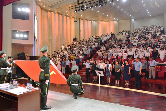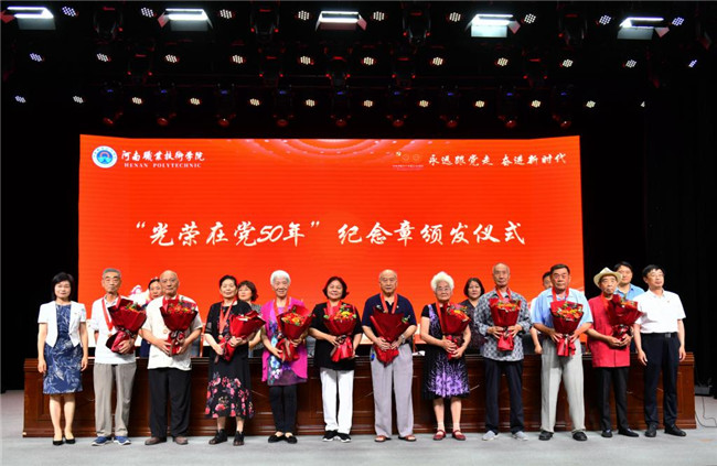 在第一個(gè)階段中,李桂貞和梅樂(lè)堂分別為受邀的10位黨齡滿50年黨員代表頒發(fā)“光榮在黨50年”紀(jì)念章,見(jiàn)證31位黨齡滿50年黨員為學(xué)校的發(fā)展付出青春和才華,是我們這一代“河職人”學(xué)習(xí)的榜樣。學(xué)校領(lǐng)導(dǎo)班子成員分別為省級(jí)和校級(jí)黨建工作樣板支部頒發(fā)牌匾,充分顯示全國(guó)首批、省級(jí)示范和校級(jí)黨建工作樣板支部,在學(xué)校基層黨建工作中的示范引領(lǐng)作用。隨后,李桂貞領(lǐng)誓,全體黨員重溫入黨誓詞,體現(xiàn)了全體黨員對(duì)黨的赤膽忠心,激勵(lì)黨員不忘初心,時(shí)刻永葆黨員的先進(jìn)性本色。