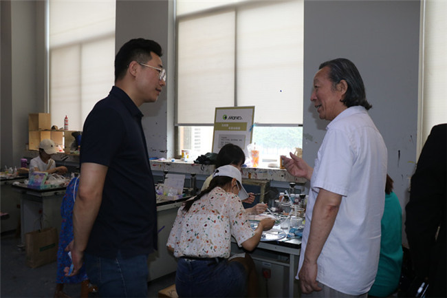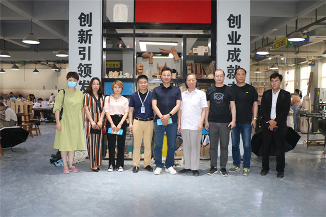 隨后,企業(yè)來賓一行3人來到藝術(shù)大樓進(jìn)行參觀。藝術(shù)學(xué)院書記韋楊建、副院長趙維平帶領(lǐng)企業(yè)來賓參觀了藝術(shù)學(xué)院建黨100周年的主題書畫展、3D打印實驗室以及木工坊實驗室,期間大家圍繞學(xué)生作品進(jìn)行了專業(yè)交流。