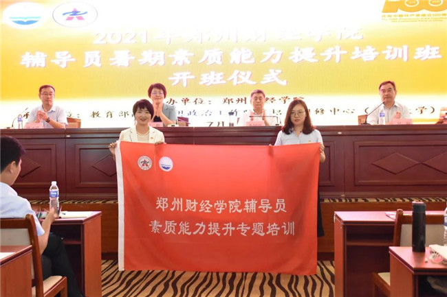 教育部高校思想政治工作隊伍培訓研修中心(鄭州大學)辦公室副主任聶娜為本次輔導員暑期素質(zhì)能力提升專題培訓班進行授旗,鄭州財經(jīng)學院學工部副部長呂洛樂接旗。