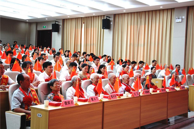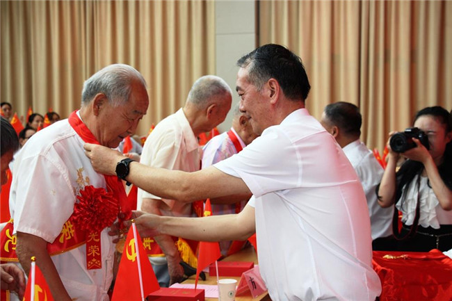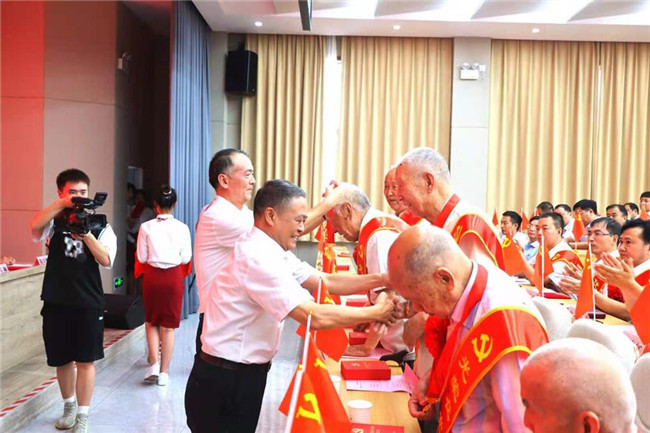 馮慰冬和宋宏偉一起走到臺下為“光榮在黨50年”老黨員代表逐一佩戴紀念章,并向老同志們表示誠摯的敬意。