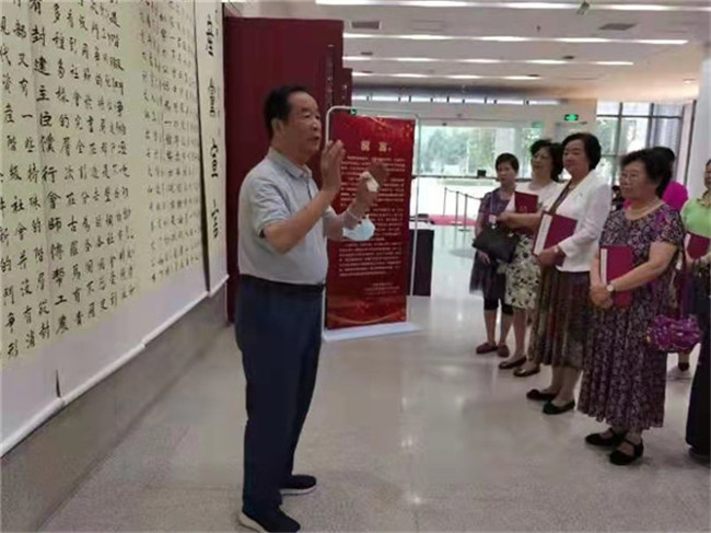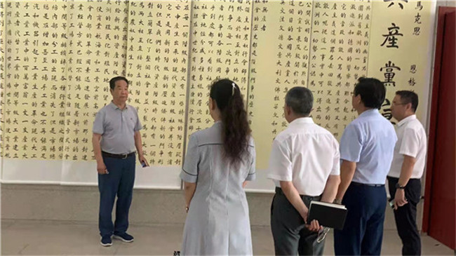 自6月29日作品展出以來,王安邦教授不顧年事已高、不畏酷暑,堅持每天早上8點準時來到展廳,激情澎湃地為大家講述了《共產黨宣言》產生的歷史背景、歷史價值和現(xiàn)實意義,特別講述了《共產黨宣言》對中國共產黨以及中國社會建設與發(fā)展的深刻影響,深刻闡述了宣言在當今社會彰顯著的巨大真理力量和時代價值,為觀展人員上了一堂生動的、特殊的黨史學習教育課。大家受益匪淺,紛紛留言表示祝賀和敬意。在不到半個月的時間里,王安邦教授已累計為該校師生黨支部開展主題黨日活動,社會各界參觀者等,專題講解20場,學習參觀者累計千余人次。每一個參觀團隊在參觀過程中,時而停留下來欣賞書法作品,時而深入交流學習心得感悟,贊嘆不斷、感動不已。河南省僑聯(lián)、銀基社區(qū)、康復社區(qū)、明理路社區(qū)的黨員同志紛紛來到這里,在學習和參觀中重溫經典著作、汲取精神營養(yǎng)、堅定初心使命。中醫(yī)藥文化學者許敬生教授及校外參觀者更是分別提筆,即興賦詩:“不忘初心耄耋年,正楷百篇書宣言。銘記黨史艱辛路,大業(yè)永興萬代傳。”“心中有馬恩,筆下見精神。字里透使命,行間顯初心。”表達自己的敬佩與感動之情。