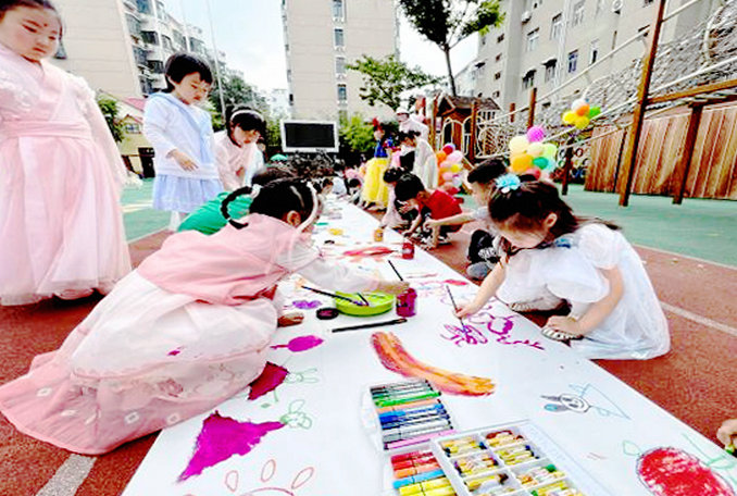 活動中,教師們依托多元文化,結(jié)合幼兒年齡特點和興趣點,設(shè)置了豐富多彩的活動區(qū)域,既有水槍大戰(zhàn)、舞臺SHOW、躲避大擺錘等游戲體驗區(qū),又有紙板涂鴉、造型噴畫、波點造型等創(chuàng)意美術(shù)體驗活動,更有投壺、皮影戲、剪紙、射箭、蹴鞠等傳統(tǒng)文化體驗區(qū)。20個游戲區(qū)域異彩紛呈,吸引著孩子們積極參與、快樂體驗。
