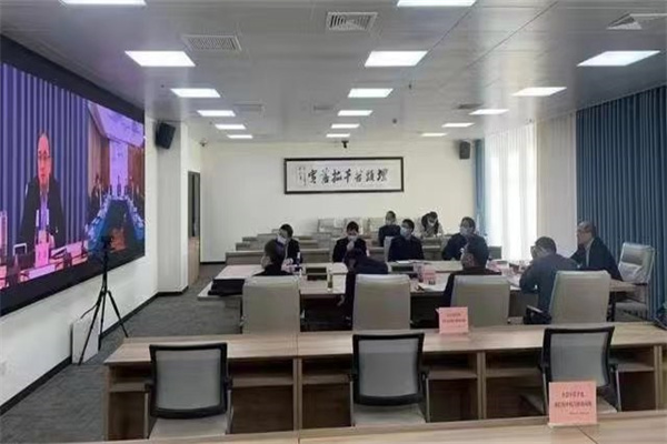 中國二十冶集團副總工程師夏士龍,市場部部長紀竹楠,投融資事業(yè)部總經理張永超,建筑工程公司總經理趙聰參加視頻會議。(喬光輝 王郡)