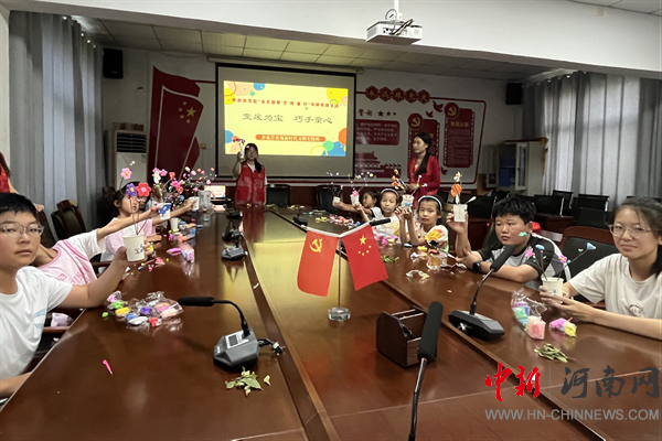 中新河南網(wǎng)7月28日電:為豐富轄區(qū)青少年的暑期生活,培育踐行主流價值,培養(yǎng)青少年勤儉樸素的生活習(xí)慣,7月28日,開封市示范區(qū)杏花營農(nóng)場新時代文明實踐所組織大學(xué)生志愿者開展2025年開封示范區(qū)“多彩假期 ‘藝’路‘童’行”文明實踐活動。本次活動以“變廢為寶 妙手童心”為主題,通過使用一次性紙杯、樹枝、超輕黏土等制作DIY花束,激發(fā)孩子們在手工活動中的創(chuàng)造力、想象力、動手能力。