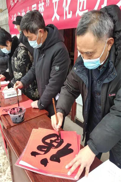 當(dāng)天上午9時許,國家書協(xié)會員趙世貴、王雪梅等8位書法家現(xiàn)場揮毫潑墨、筆走龍蛇,為許村群眾書寫最美好的新春祝福,行書、隸書、楷書等多種字體各顯神韻,“迎新春江山錦繡、辭舊歲事泰輝煌”……一副副寓意祥和的春聯(lián),一張張喜慶的“福”字,表達(dá)著對美好生活的祝福。許村群眾熱情簇?fù)碓谧狼埃瑺幭噙x擇自己喜歡的春聯(lián),個個臉上樂開了花。(馬治衛(wèi) 康國富)