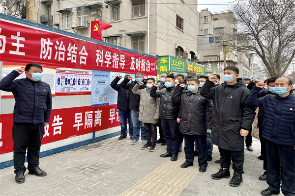 “我志愿加入中國共產(chǎn)黨,擁護(hù)黨的綱領(lǐng),遵守黨的章程,履行黨員義務(wù)……”,全體黨員面向黨旗莊嚴(yán)地舉起右手,鏗鏘有力地重溫入黨誓詞,宣誓出每位黨員在疫情防控工作中的信心和決心。