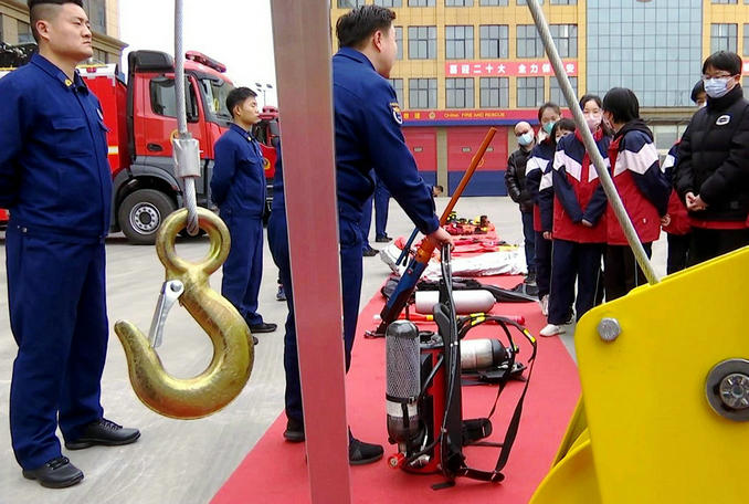 隨后,講解員帶領(lǐng)同學(xué)們觀看了攀登掛鉤梯、4樓攀爬繩索、初戰(zhàn)快速出水控火操等日常訓(xùn)練科目。