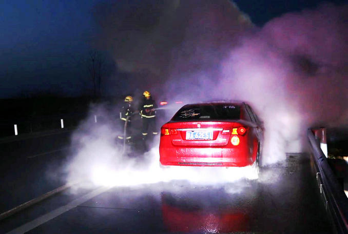 到達現(xiàn)場后,消防救援人員發(fā)現(xiàn):一輛紅色的小轎車發(fā)生自燃,發(fā)動機艙有滾滾濃煙正在冒出,隨時有爆燃的危險。