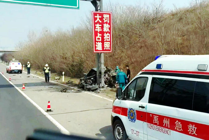 到達(dá)現(xiàn)場(chǎng)后,消防救援人員發(fā)現(xiàn):一輛轎車撞向高速公路的路牌支柱,車輛整體旋轉(zhuǎn)180度,車頭部位嚴(yán)重?fù)p毀,駕駛室變形,駕駛員雙腿被卡在儀表臺(tái)下方。經(jīng)醫(yī)護(hù)人員簡單檢查,被困駕駛員意識(shí)清醒,暫無生命危險(xiǎn)。