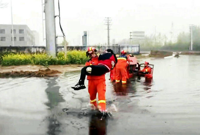 救援人員徒步涉水靠近三輪車,先把被困人員解救出來(lái),然后冒雨把三輪車從水坑中緩慢推出。
