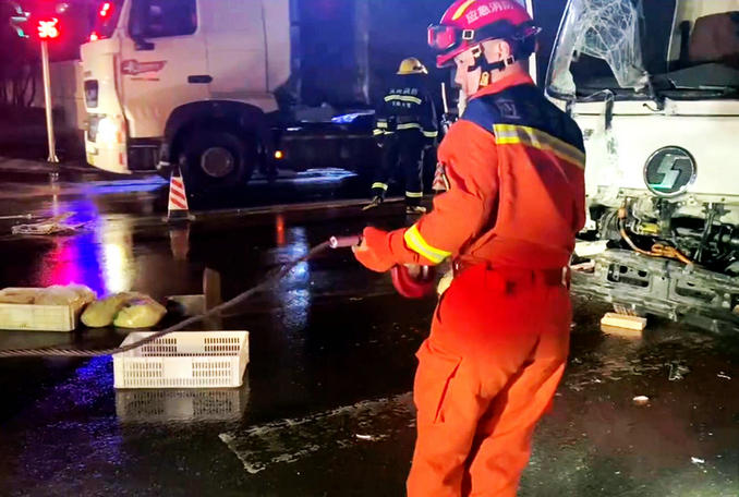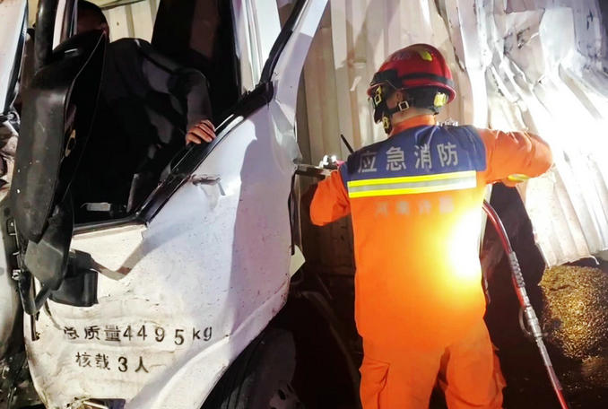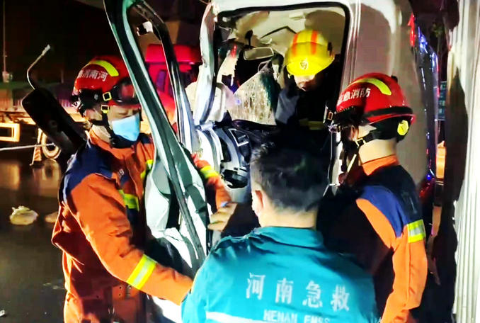 河南長葛:兩輛貨車發(fā)生追尾一人被困 消防隊(duì)員立即趕赴破拆救援