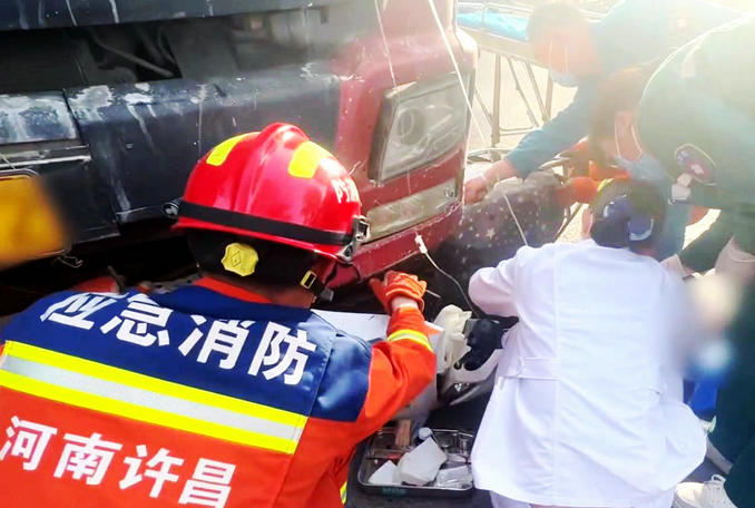 河南禹州:貨車和電動(dòng)車相撞一人被困 消防隊(duì)員迅速趕赴現(xiàn)場救援