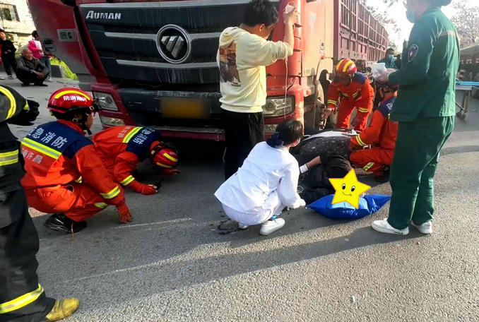 到達(dá)現(xiàn)場后,救援人員發(fā)現(xiàn):一輛貨車與一輛二輪電動(dòng)車相撞,騎車?yán)先说碾p腳被卡在車底。
