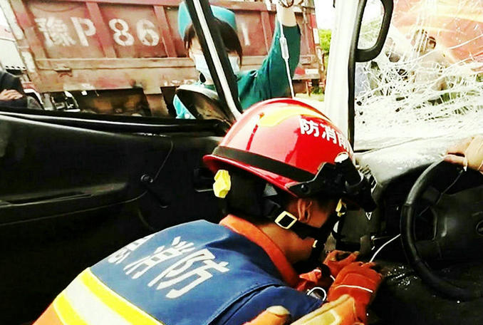 河南長葛:面包車追尾半掛車一人被困 消防隊員立即趕赴破拆救援