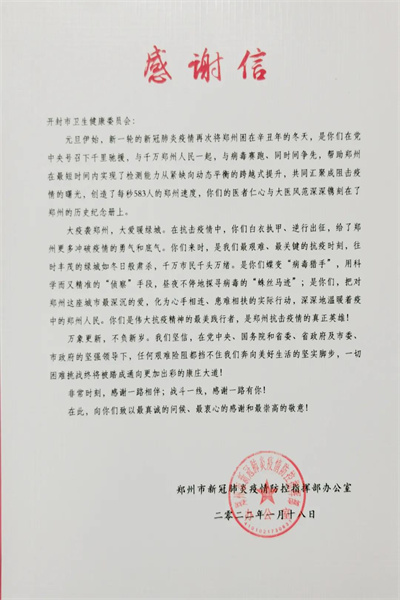 元旦伊始,新一輪的新冠肺炎疫情再次將鄭州困在辛丑年的冬天,是你們?cè)邳h中央號(hào)召下千里馳援,與千萬鄭州人民一起,與病毒賽跑、同時(shí)問爭先,幫助鄭州在最短時(shí)間內(nèi)實(shí)現(xiàn)了檢測能力從緊缺向動(dòng)態(tài)平衡的跨越式提升,共同匯聚成阻擊疫情的曙光,創(chuàng)造了每秒583人的鄭州速度,你們的醫(yī)者仁心與大醫(yī)風(fēng)范深深鐫刻在了鄭州的歷史紀(jì)念冊(cè)上。