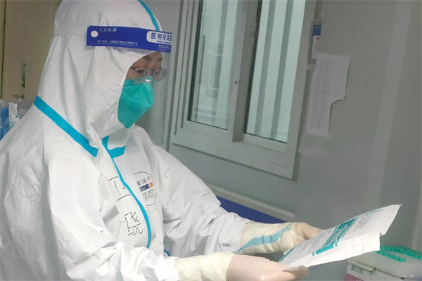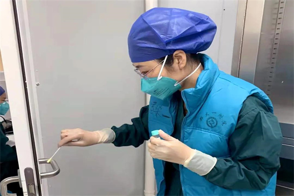 在岐伯山醫(yī)院,衛(wèi)曉梅主要負(fù)責(zé)對所有工作人員進(jìn)行穿脫防護(hù)用品、職業(yè)暴露、血液體液賤撒、呼吸道職業(yè)暴露、地面物表消毒培訓(xùn),進(jìn)入污染區(qū)指導(dǎo)采樣人員采樣、送檢,指導(dǎo)病區(qū)每班消毒和終末消毒。24小時(shí)全方位對一脫、二脫工作人員防護(hù)用品脫卸進(jìn)行監(jiān)督。每周兩次進(jìn)行高頻接觸物體表面采樣,每天對科室清潔區(qū)和污染區(qū)進(jìn)行督導(dǎo),對發(fā)現(xiàn)問題,現(xiàn)場溝通,現(xiàn)場協(xié)調(diào)解決,閉環(huán)管理。嚴(yán)格檢查規(guī)避醫(yī)護(hù)人員、患者、隔離區(qū)域隨時(shí)存在的感染風(fēng)險(xiǎn)。她的工作繁瑣而復(fù)雜,需要細(xì)致入微、步步到位。每次一進(jìn)入病區(qū),衛(wèi)曉梅就變成了“失聯(lián)”的狀態(tài),一整天無法與其聯(lián)系。有好幾次她上小學(xué)的兒子實(shí)在太想念媽媽,就偷偷給她打電話,但是卻總是無人接聽。