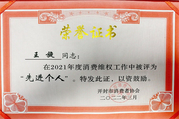 同時(shí),全市49人獲“2021年度消費(fèi)維權(quán)先進(jìn)個(gè)人”榮譽(yù)稱號(hào),其中開封市中心醫(yī)院王旋獲此殊榮。