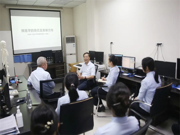 隨后楊國仁教授來到核醫(yī)學(xué)科,就核醫(yī)學(xué)科發(fā)展規(guī)劃、醫(yī)療管理、專業(yè)技術(shù)、科研教學(xué)等方面進(jìn)行詳細(xì)地交流與分享。對(duì)于年輕醫(yī)生提出的疑難問題,他從病理生理、臨床表現(xiàn)、影像學(xué)特點(diǎn)、新的分子探針應(yīng)用、科研思路等多維度、多角度、多方位進(jìn)行詳盡的分析闡述,讓大家領(lǐng)略到分析、思考、解決疑難問題和科研創(chuàng)新的思路歷程。