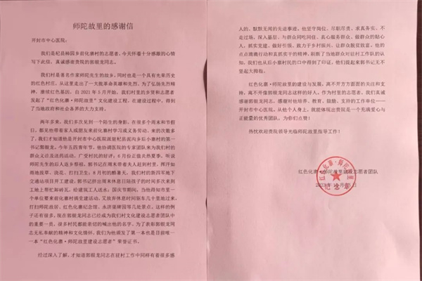 郭銀龍同志的行動感動了淳樸的村民,前不久當(dāng)?shù)厝罕姙樗蛠硪环飧兄x信,并為他頒發(fā)了第一本也是目前唯一一本“紅色化寨·師陀故里建設(shè)志愿者”榮譽(yù)證書。志愿者團(tuán)隊代表親臨我院,真誠感謝郭銀龍同志的無私付出,感謝對他培養(yǎng)、教育、鼓勵、支持的工作單位——開封市中心醫(yī)院。他們說:“從郭書記個人身上,就能感受到貴院是一個充滿愛心與正能量的優(yōu)秀團(tuán)隊,為你們點贊!”