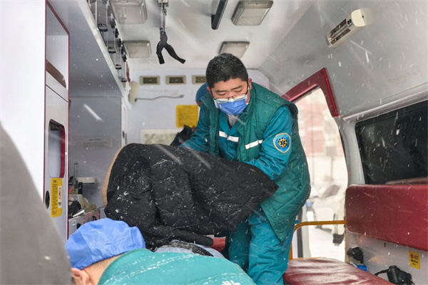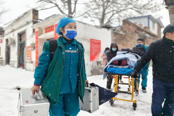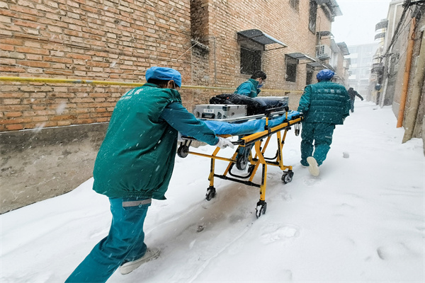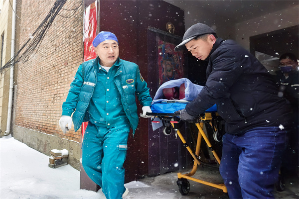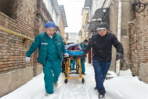 “一!二!三!咱們四個(gè)人一人抬一個(gè)角,小心腳下,往前走!”在高醫(yī)生的指揮下,眾人將患者抬上擔(dān)架,小心翼翼地穿過下坡臺(tái)階,步入厚重積雪覆蓋的胡同巷子中。