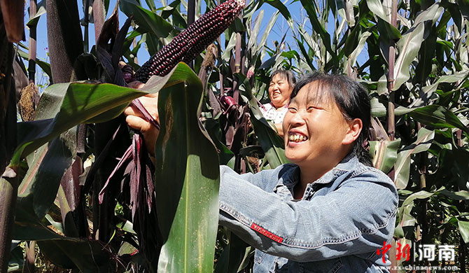 中新河南網(wǎng)9月18日電(記者 高新科 通訊員 陳娟 )又是一年金秋時節(jié),濟源大地處處洋溢著豐收景象!9月16日,記者走進濟源示范區(qū)下冶鎮(zhèn)北桐村黑玉米種植基地,看到成方連片的玉米長勢喜人,紫紅色的玉米葉隨風起舞,一棵棵玉米稈“抱”著沉甸甸的玉米棒子,很是誘人。剝開玉米苞葉,飽滿、勻稱的玉米粒,在陽光的映照下黑紅發(fā)亮,惹人喜愛。