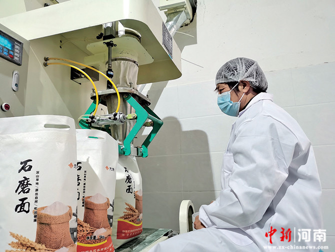 圖② 11月5日,在濟源示范區(qū)承留鎮(zhèn)張河村村集體辦的面粉廠上班的脫貧戶原雪環(huán)在加工石磨面粉。