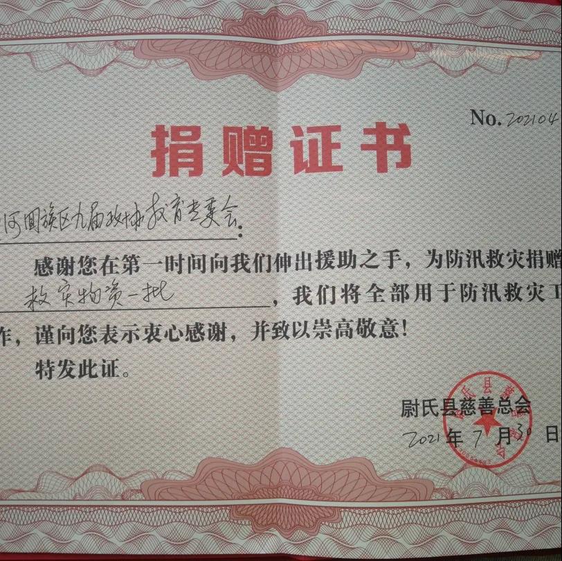 大汛當(dāng)前,區(qū)政協(xié)教育專委會委員們主動擔(dān)負(fù)起社會責(zé)任,積極行動起來,向尉氏縣慈善總會捐贈了大米20袋、食用油20桶、消毒水48瓶,消殺設(shè)備10套等生活急需物資(價值5000余元),給受災(zāi)群眾送去了最真誠的問候。