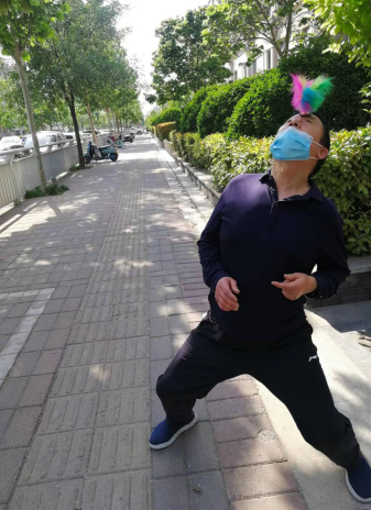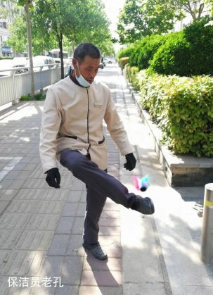 還有個保安老王經(jīng)常跟他學踢毽子,有一個姓雷的女士,一下班就學他踢毽子,即鍛煉身體,又放松一下,減減工作壓力。