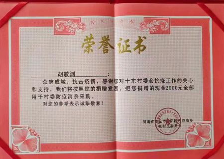 他還曾寄過愛心包裹,參與愛心募捐,把一片愛心傳遞到了更多需要關(guān)愛的人心中……累計(jì)為災(zāi)區(qū)、貧困兒童捐款捐物6000多元,受到社會(huì)的一致好評(píng)。印象最深的一次是2020年在老家過春節(jié),剛好趕上疫情,在胡敬淵的強(qiáng)烈要求下,爺爺陪他一起,用自己的壓歲錢向村委會(huì)捐贈(zèng)現(xiàn)金2000元。當(dāng)值班人員看到是孩子來捐款時(shí),執(zhí)意不接受,他說,國(guó)家有難,疫情嚴(yán)重,我們少先隊(duì)員也要表示我們的心意。隨后又多次購(gòu)買消毒液和酒精給醫(yī)護(hù)人員送去,并告訴叔叔阿姨一定要做好自我防護(hù)。