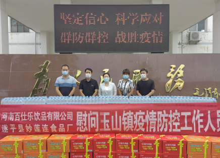 河南百仕樂飲品有限公司、遂平縣妙蓮連食品廠為玉山鎮(zhèn)捐贈物資