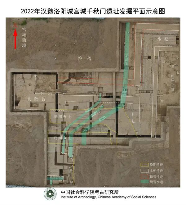 2022年春,考古人員在對千秋門門址進(jìn)行的考古解剖發(fā)掘中,發(fā)現(xiàn)了漢代、魏晉、北魏時期磚砌、石砌水道遺跡。這些遺跡屬于漢魏時期向?qū)m城內(nèi)引水和向?qū)m城內(nèi)排水的城市水利系統(tǒng)的重要組成部分。其中發(fā)現(xiàn)的不晚于漢代的大型磚砌拱券式水道,由內(nèi)外兩重砌磚構(gòu)成,內(nèi)寬1.2米,不僅結(jié)構(gòu)完整、規(guī)模巨大,而且也是漢魏洛陽城早期建筑遺跡的重要發(fā)現(xiàn)。