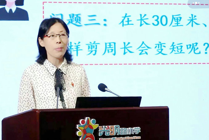 許昌市光明路學校教育集團王海燕老師帶來了《再探周長》研討課與《聚焦“大問題”挖掘“深”思維》——《再探周長》的教學實踐與思考。王老師精心整合設計開放性的大問題,問題引發(fā)學生的深度思考。問題引領直擊數(shù)學本質(zhì),讓學生對于周長的概念有了更深刻的認識。課的結(jié)尾,讓學生帶著疑問和思考走出課堂,利用學到的知識和方法繼續(xù)探究,體現(xiàn)了學無止境的教育理念。