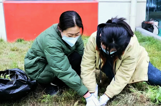 女同志的工作也不簡單,占地面積7500㎡的草坪內,雜草叢生,有的野蒿子長成了“精”,比我們的身高還要高。幾個女同志你拉著我、我拉著她、她拉著成“精”的野蒿子,像“小白兔拔蘿卜”一樣,一起用力才拔出來。