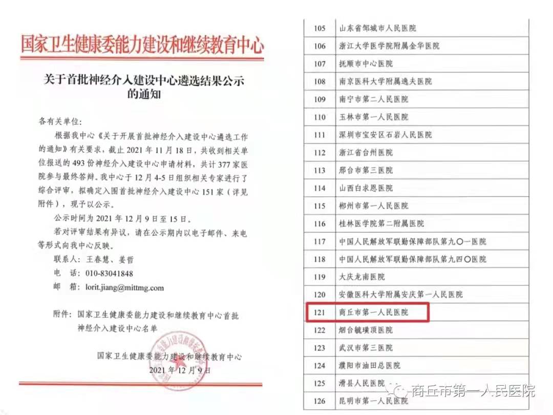中新河南網(wǎng)商丘12月21日電(刁玉磊 通訊員 靳久增)12月9日,國家衛(wèi)生健康委能力建設(shè)和繼續(xù)教育中心印發(fā)了《關(guān)于開展首批神經(jīng)介入建設(shè)中心遴選結(jié)果公示的通知》,全國151家醫(yī)療機(jī)構(gòu)成功入選,其中河南省有10家醫(yī)院入圍,商丘市第一人民醫(yī)院是全市唯一一家入選公示名單的醫(yī)院。