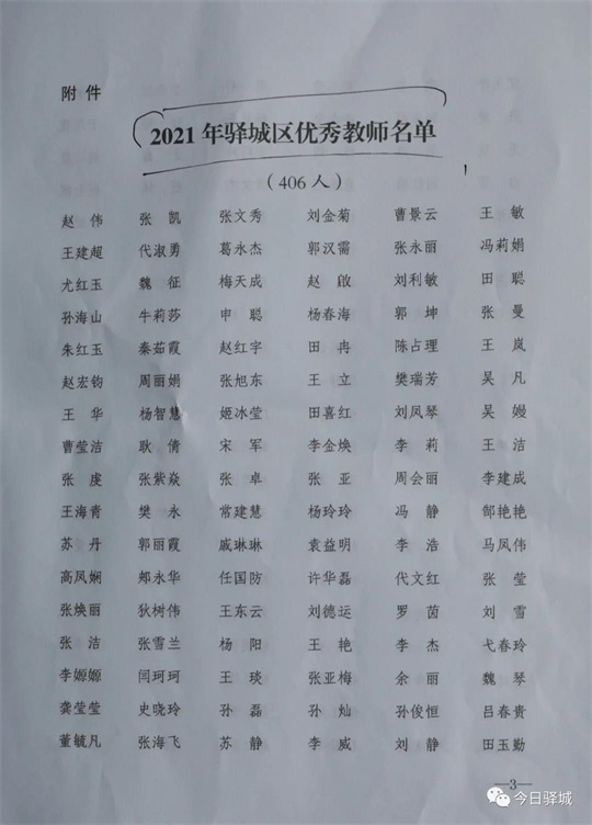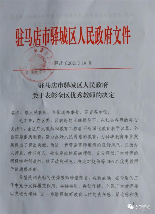 為進(jìn)一步營(yíng)造尊師重教的良好風(fēng)氣,弘揚(yáng)為人師表、教書育人、敬業(yè)奉獻(xiàn)的高尚師德,充分調(diào)動(dòng)廣大教師的積極性和創(chuàng)造性,經(jīng)驛城區(qū)政府研究,決定對(duì)全區(qū)406名優(yōu)秀教師予以通報(bào)表彰。