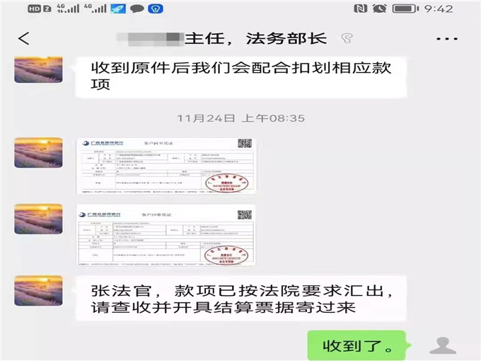 執(zhí)行干警按照申請人提供的企業(yè)賬戶線索,依法進行了查詢,發(fā)現(xiàn)企業(yè)名下并無財產(chǎn)可供執(zhí)行,但執(zhí)行干警并未放棄,經(jīng)仔細研究,發(fā)現(xiàn)該化冶公司存在公司名稱變更歷史,且變更后的企業(yè)名下有一筆到期貨款,執(zhí)行干警立即將該筆貨款凍結(jié),但由于疫情原因無法去往當?shù)剡M行扣劃,于是執(zhí)行干警又通過電話與新公司的法務部部長取得聯(lián)系,耐心做對方思想工作,告知其不履行生效判決的后果。對于經(jīng)營者而言,賬戶被查封固然可怕,但企業(yè)信譽受到影響更是難以彌補,會直接影響企業(yè)今后的經(jīng)營活動。經(jīng)過幾個回合的調(diào)解,終于功夫不負有心人,對方公司同意郵寄接收法律文書,工作證等,并全額履行生效法律文書確定的義務,案件得以成功結(jié)案。