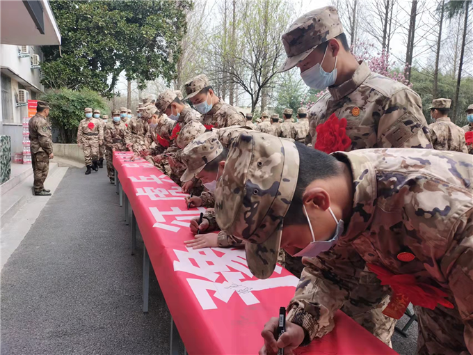 接著,新兵們面向黨旗做出莊嚴宣誓,堅決聽黨指揮,報效祖國。出席歡送會的領導為新兵們佩戴豫兵徽章和大紅花。鮮花映新孔,徽章閃魂魄,從這里新兵將踏上新的征程。接下來,新兵們在紅色長幅上莊重簽下自己名字,一諾千金來,盡顯報國志。