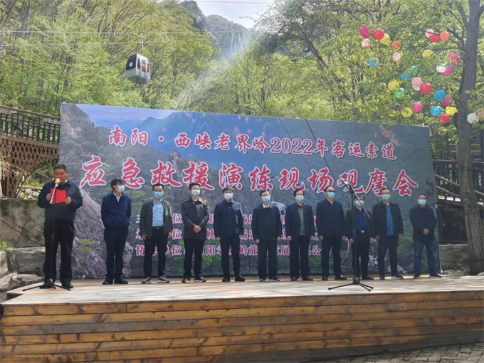 南陽市2022年西峽老界嶺客運索道應(yīng)急救援演練現(xiàn)場觀摩會由南陽市市場監(jiān)管局和西峽縣政府主辦,西峽縣市場監(jiān)管局和太平鎮(zhèn)人民政府承辦,南陽老界嶺旅游開發(fā)有限公司協(xié)辦。市市場監(jiān)管局黨組成員、副局長劉振江,西峽縣政府副縣長崔淅周,市市場監(jiān)管局特監(jiān)科、應(yīng)急辦、綜合科,西峽縣市場監(jiān)管局、西峽縣應(yīng)急管理局 、西峽縣文廣旅局 、太平鎮(zhèn)政府、省特檢院南陽分院、南陽市電梯智能監(jiān)控中心等單位相關(guān)負責(zé)同志現(xiàn)場督導(dǎo)救援演練。西峽、內(nèi)鄉(xiāng)、南召縣局特種設(shè)備業(yè)務(wù)分管局長及股長、全市客運索道運營單位負責(zé)人、索道站站長現(xiàn)場觀摩演練。